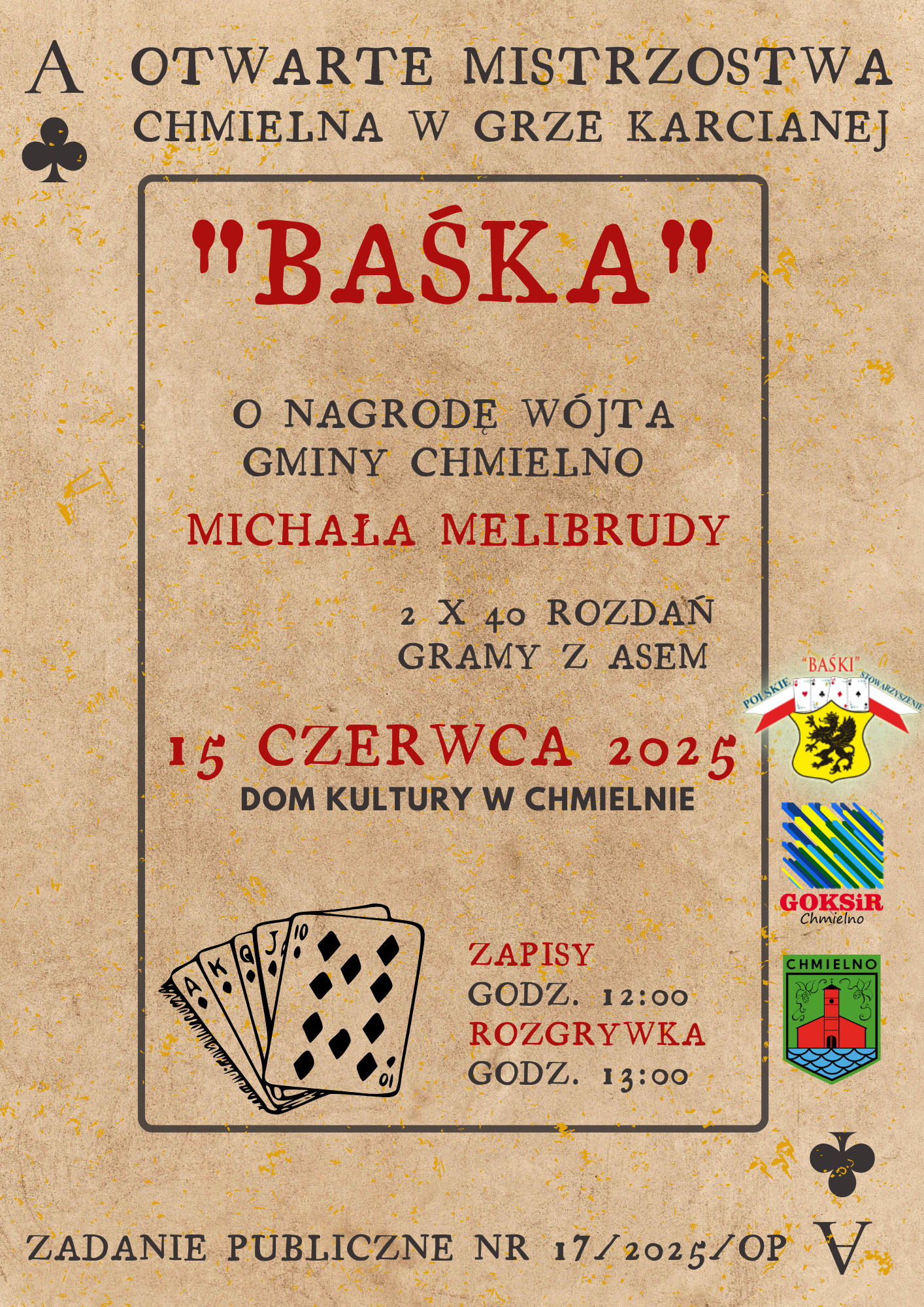 Zawodnicy rozegrają 2 x 40 rozdań, a emocji z pewnością nie zabraknie! Zapisy rozpoczną się o godzinie 12.00, natomiast start rozgrywek przewidziano na 13.00. Turniej organizowany jest w ramach zadania publicznego nr 17/2025/OP, a wydarzenie wspierają: GOKSiR Chmielno, Gmina Chmielno oraz Polski Związek Baśki – PZBaśka.