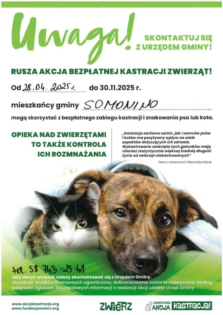 Gmina Somonino rusza z kolejną edycją Programu opieki nad zwierzętami bezdomnymi oraz zapobiegania bezdomności zwierząt. W ramach działań zaplanowanych na 2025 rok mieszkańcy gminy mogą skorzystać z bezpłatnych zabiegów kastracji, sterylizacji oraz czipowania kotów i psów.