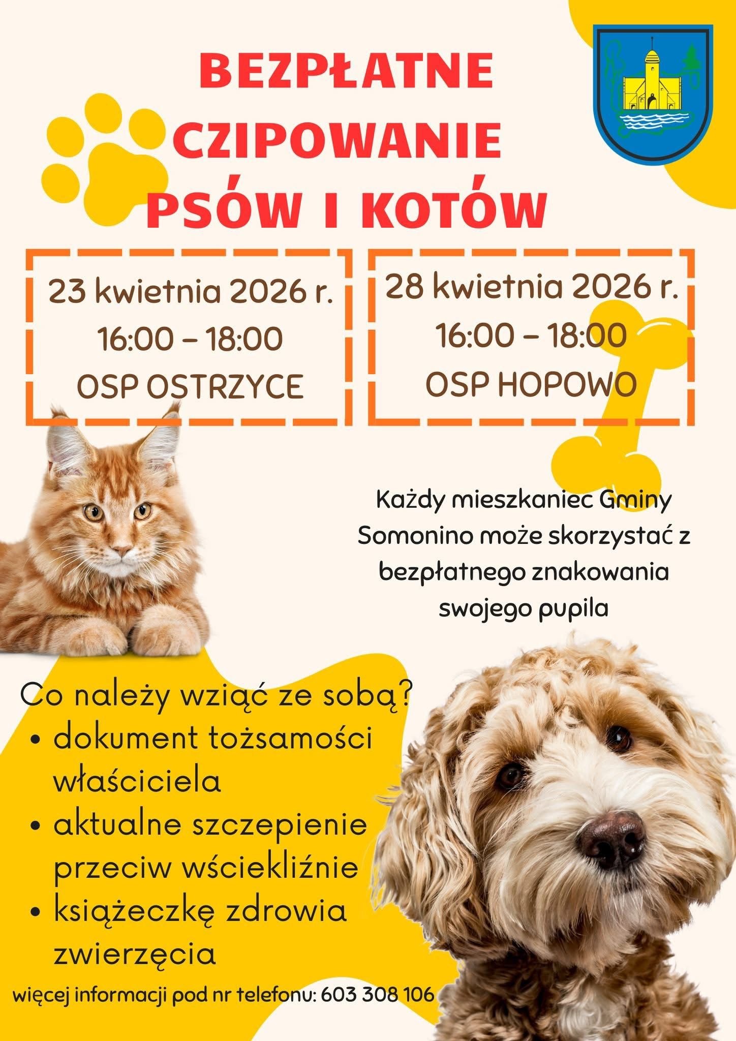 Mieszkańcy gminy Somonino będą mogli bezpłatnie zaczipować swoje zwierzęta. Akcja odbędzie się w dwóch terminach i lokalizacjach na terenie gminy, a jej celem jest zwiększenie bezpieczeństwa pupili oraz ułatwienie ich odnalezienia w przypadku zaginięcia.