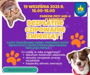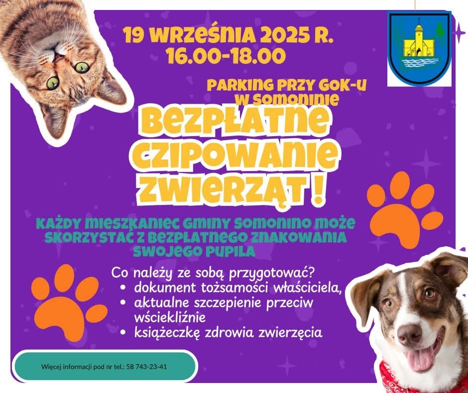 W piątek, 19 września 2025 roku, na parkingu przy Gminnym Ośrodku Kultury w Somoninie odbędzie się bezpłatna akcja znakowania zwierząt domowych. Wydarzenie potrwa od godziny 16.00 do 18.00.