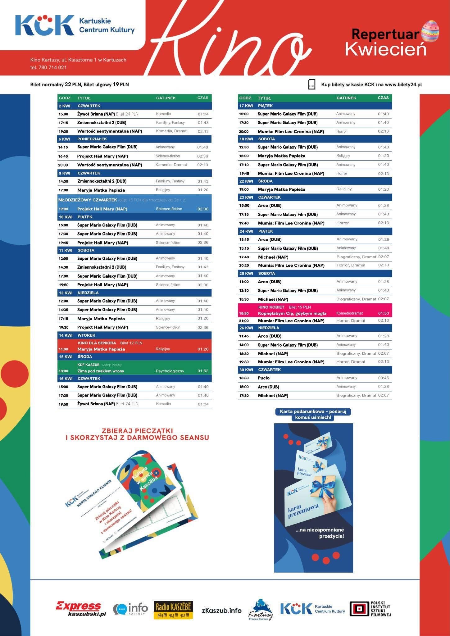 Kwietniowy repertuar w Kinie Kartuzy został już opublikowany. W programie znalazły się zarówno nowości, jak i propozycje dla dzieci, młodzieży oraz dorosłych.
