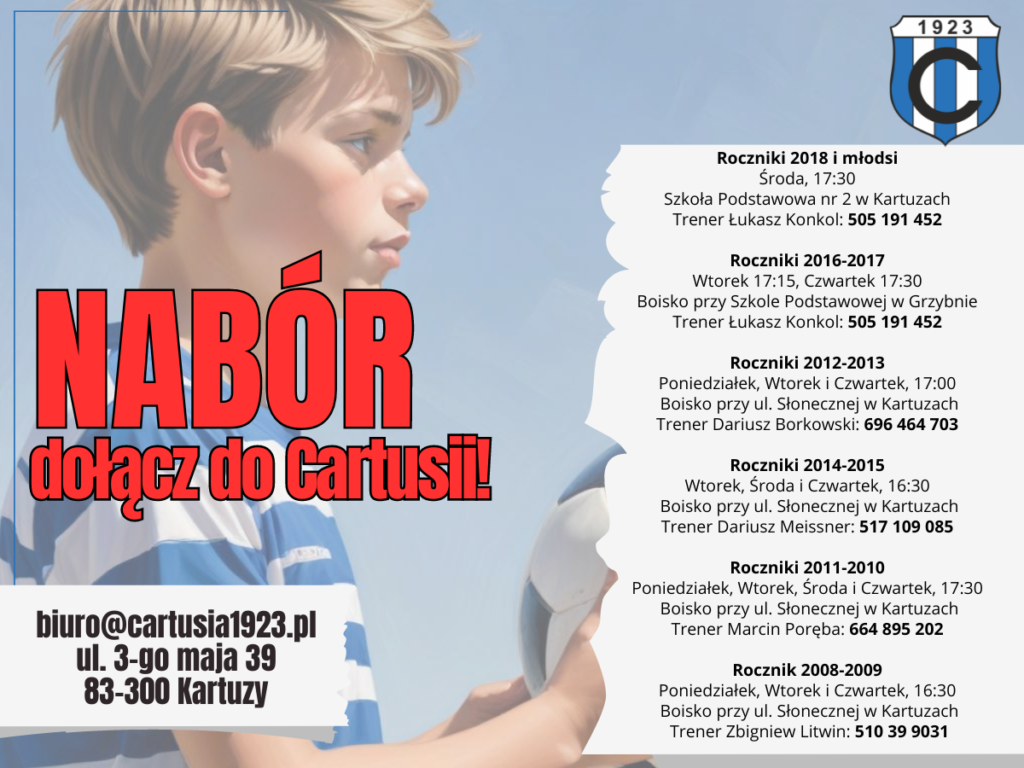 Klub piłkarski Cartusia1923 prowadzi nabór na zajęcia piłkarskie, które są doskonałą okazją, aby rozwijać swoje umiejętności i pasję do futbolu! Oferta jest skierowana do młodych zawodników w różnym wieku i na różnych poziomach zaawansowania.