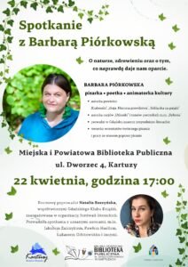 Już 22 kwietnia o godz. 17.00 odbędzie się spotkanie z Barbarą Piórkowską – pisarką, poetką i animatorką kultury. Wydarzenie poświęcone będzie tematom natury, zdrowia oraz tego, co daje człowiekowi oparcie w codziennym życiu.