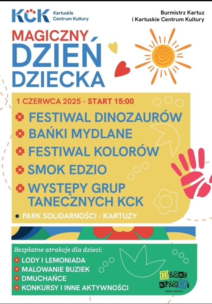 1 czerwca od godziny 15.00 w Parku Solidarności w Kartuzach odbędzie się radosne świętowanie Dnia Dziecka. Wydarzenie organizowane jest przez Burmistrza Kartuz Mieczysława Grzegorza Gołuńskiego, Kartuzy Stolica Kaszub oraz Kartuskie Centrum Kultury.