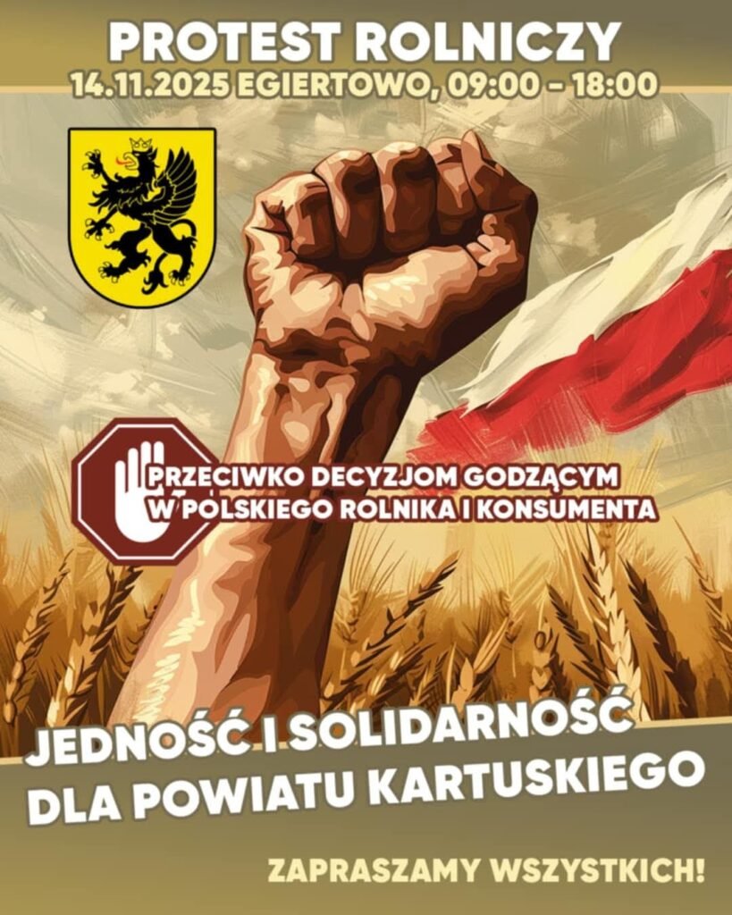 Już w najbliższy piątek 14 listopada w Egiertowie (gm. Somonino) organizowany jest protest konsumencko-rolniczy. Organizatorzy sprzeciwiają się m. in. napływowi niezdrowej żywności z Ukrainy. Krytykują też działania obecnego rządu w zakresie dbałości o interesy polskiej wsi.