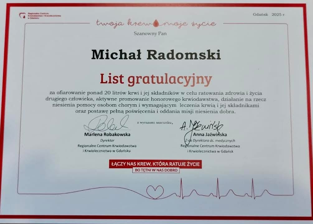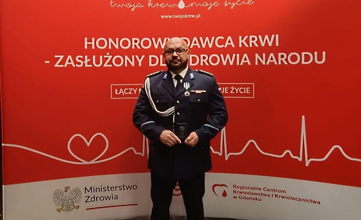 11 grudnia 2025 roku w Kartuskim Centrum Kultury odbyła się uroczystość wręczenia odznaki „Honorowy Dawca Krwi – Zasłużony dla Zdrowia Narodu”. Odznaczenie nadawane przez Ministra Zdrowia trafiło do dyżurnego Komendy Powiatowej Policji w Kartuzach, asp. sztab. Michała Radomskiego.