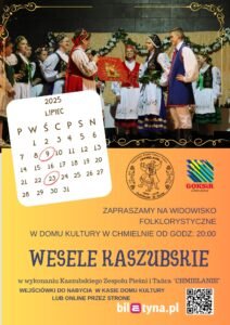 W środę, 23 lipca 2025 r., o godzinie 20.00 w sali widowiskowej Domu Kultury w Chmielnie zaplanowano widowisko folklorystyczne „Kaszubskie Wesele” w wykonaniu Kaszubskiego Zespołu Pieśni i Tańca „Chmielanie”. Bilety dostępne są przed spektaklem oraz online na stronie TUTAJ