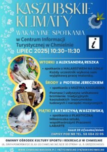 W każdy wtorek, środę i piątek w Centrum Informacji Turystycznej w Chmielnie odbywają się wakacyjne warsztaty „Kaszubskie Klimaty”, dedykowane całym rodzinom, a w szczególności dzieciom. Zapisy przyjmowane są pod numerem telefonu 58 684 22 05.