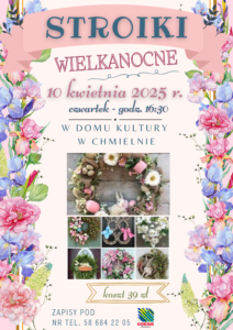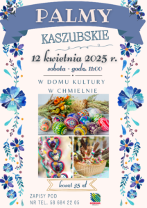 W Domu Kultury w Chmielnie o godz. 11.00 odbędą się warsztaty tworzenia tradycyjnych kaszubskich palm wielkanocnych. Koszt udziału to 35 zł. Serdecznie zapraszamy całe rodziny – to świetny sposób na poznanie lokalnych tradycji i wspólne spędzenie czasu.