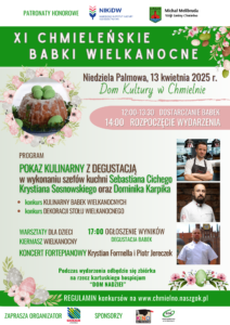 Kulminacją tygodnia będzie XI edycja konkursu „Chmieleńskie Babki Wielkanocne”. Od godz. 14.00 uczestnicy będą rywalizować o tytuł najsmaczniejszej, najpulchniejszej czy najbajeczniejszej babki.