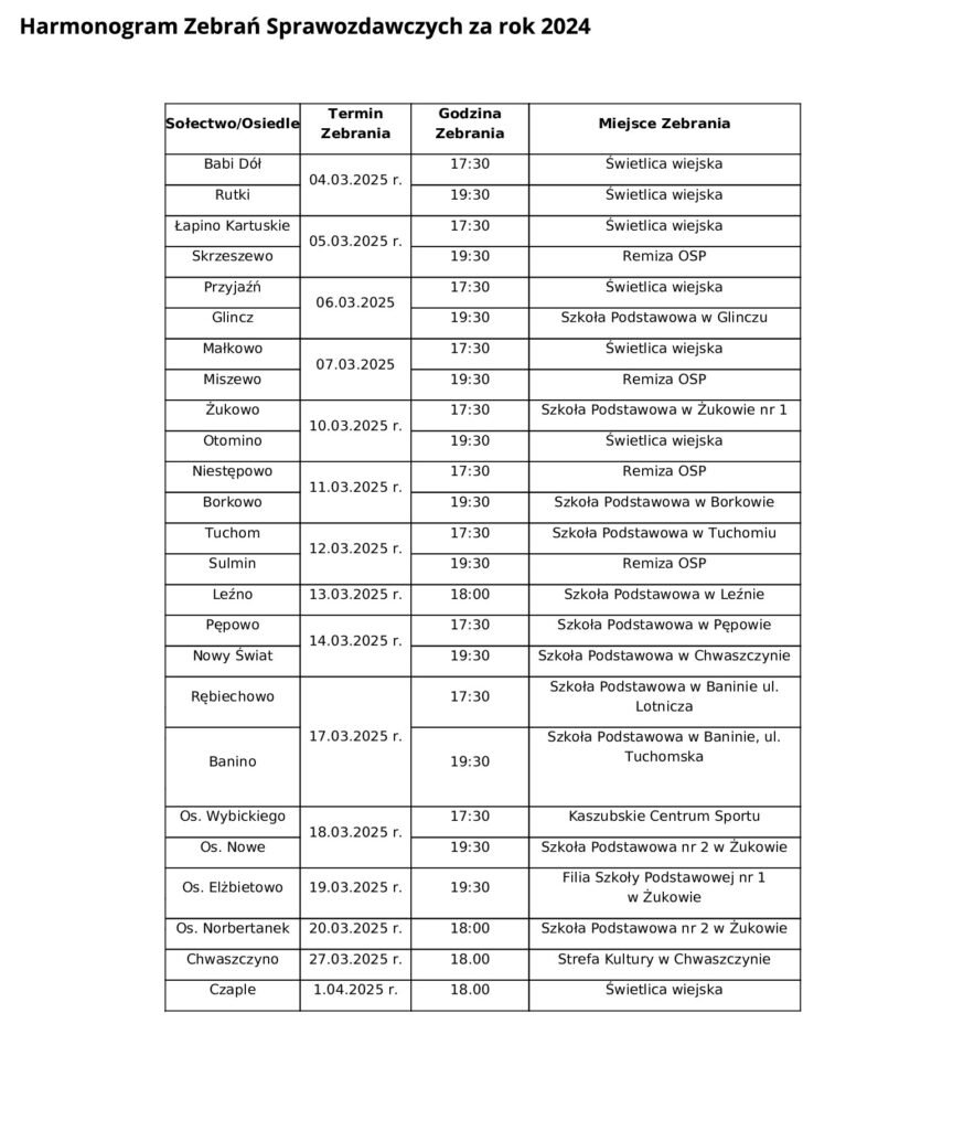 Gmina Żukowo zaprasza mieszkańców na zebrania sprawozdawcze, podczas których przedstawione zostaną raporty z działalności sołectw i osiedli za rok 2024. To doskonała okazja, by podsumować miniony rok i porozmawiać o planach na przyszłość.