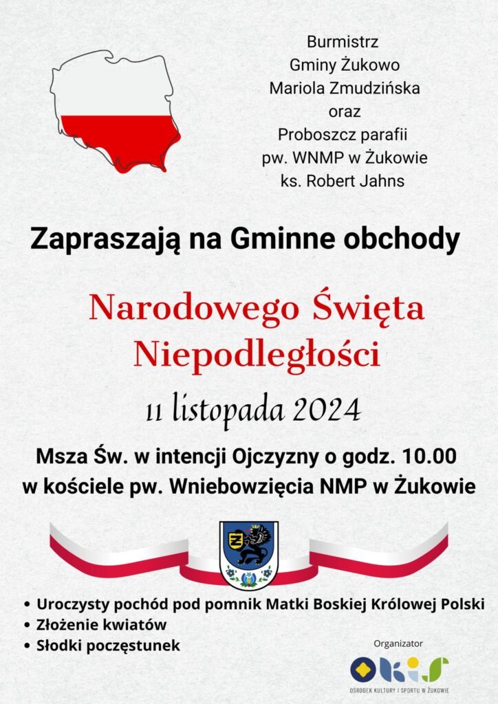 Zbliża się dzień, który w sercach Polaków wzbudza szczególne emocje – 11 listopada, Narodowe Święto Niepodległości. W tym roku gmina Żukowo zaprasza wszystkich mieszkańców oraz gości na uroczystości, które będą miały na celu uczczenie pamięci o wydarzeniach sprzed ponad wieku oraz złożenie hołdu tym, którzy walczyli o wolność naszej Ojczyzny.