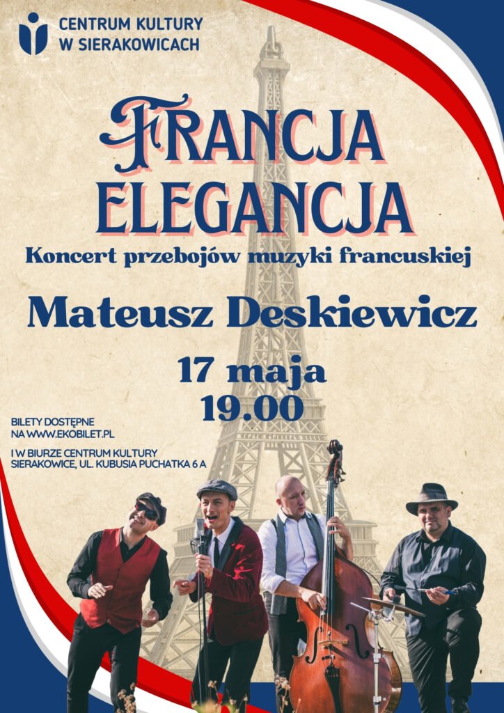 Centrum Kultury w Sierakowicach zaprasza na wyjątkowy koncert, który przeniesie Was prosto do serca Paryża! Już 17 maja 2025 roku scena wypełni się dźwiękami niezapomnianych francuskich przebojów – od klasyki po nowoczesne aranżacje.