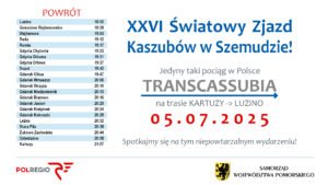 Na zjazd przyjedzie specjalny pociąg z uczestnikami z całego regionu. Organizatorzy zapowiadają także stoiska z regionalnymi przysmakami, występy kaszubskich zespołów oraz okazję do wspólnego śpiewania kaszubskich pieśni.