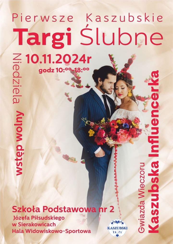 Pierwsze Kaszubskie Targi Ślubne odbędą się w Sierakowicach, czyli słynnej “krainie miłości” już w niedzielę 10 listopada br. od godz. 10 do 18. Wstęp jest wolny. Targi będą doskonałą okazją do zaprezentowania swoich usług, związanych z branżą ślubną, takich jak: fotografia, filmowanie, dekorowanie, didżejka i wodzirejka, drink-bary, koordynatorzy ślubni, namioty imprezowe, fotobudki 360, sale weselne, cateringi i wiele innych.