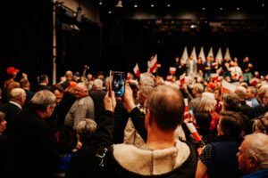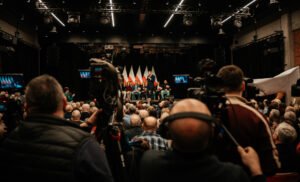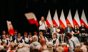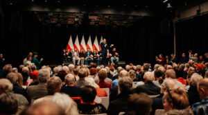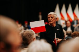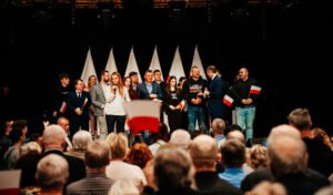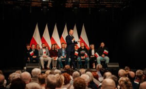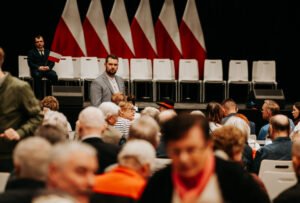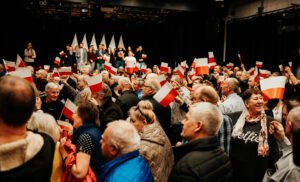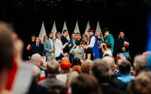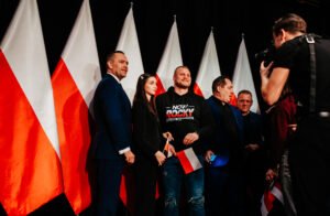 “-Polska to jest wielka sprawa” – mówił Karol Nawrocki, wspierany przez PiS kandydat na prezydenta Polski. Wśród osób zebranych w Żukowie na spotkaniu z pretendentem znalazł się m. in. Patryk Zaborowski, stojący na czele klubu “Rebelia”, którego K. Nawrocki przywitał osobiście.