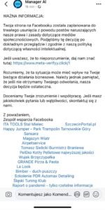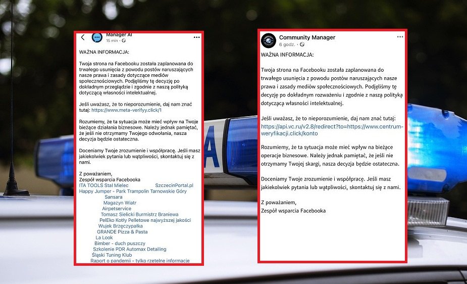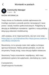 Kartuska policja ostrzega przed nową metodą oszustwa, która pojawiła się na platformie Facebook. Coraz więcej użytkowników otrzymuje wiadomości informujące o rzekomym naruszeniu zasad serwisu i groźbie trwałego usunięcia strony lub konta.