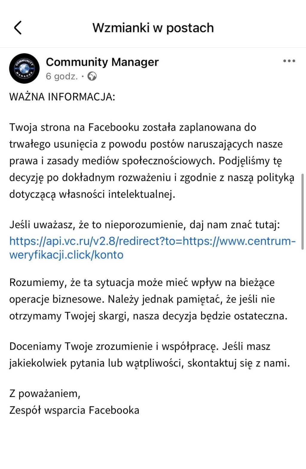 W treści wiadomości znajduje się link, który ma umożliwić „złożenie odwołania”. Po jego kliknięciu użytkownik zostaje przekierowany na fałszywy formularz logowania do Facebooka. Strona wygląda wiarygodnie i informuje, że w przypadku braku weryfikacji konto zostanie zablokowane w ciągu 48 godzin.