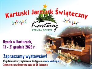 W Kartuzach trwają przygotowania do tegorocznego Kartuskiego Jarmarku Świątecznego. Wydarzenie odbędzie się na Rynku w dniach od 13 do 21 grudnia 2025 roku i jak co roku zgromadzi wystawców oferujących rękodzieło, wyroby regionalne, dekoracje świąteczne oraz sezonowe przysmaki.