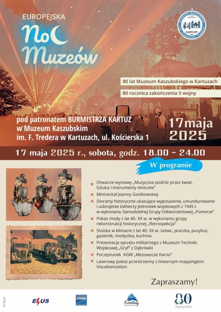 Muzeum Kaszubskie w Kartuzach po raz kolejny zaprasza na pełną atrakcji Europejską Noc Muzeów. Już 17 maja na uczestników czekać będą liczne atrakcje takie jak m.in. pokaz mody z lat 40., wystawa sprzętu militarnego, minirecital Joanny Gostkowskiej czy laserowe show połączone z mappingiem. Patronat nad wydarzeniem objął Burmistrz Kartuz Mieczysław Grzegorz Gołuński.