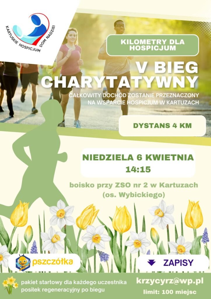 Całkowity dochód z wydarzenia zostanie przekazany na wsparcie stacjonarnego hospicjum w Kartuzach. Każdy uczestnik otrzyma pakiet startowy oraz posiłek regeneracyjny po biegu. Szczegóły na plakacie poniżej.