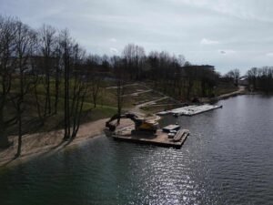 Obecnie intensywnie montowana jest konstrukcja promenady, która po zakończeniu budowy zapewni spacerowiczom wyjątkowy widok na jezioro i otaczającą przyrodę. To jednak nie wszystko — równolegle prowadzone są wewnętrzne prace instalacyjne w budynku obsługi plaży.