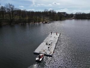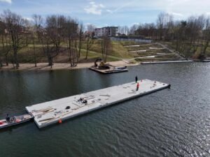Prace nad nowym kąpieliskiem miejskim nad Jeziorem Klasztornym Dużym w Kartuzach wchodzą w kolejny etap. W ubiegłym tygodniu na teren inwestycji przetransportowano pomosty pływające, które staną się centralnym elementem rekreacyjnym nowej plaży.