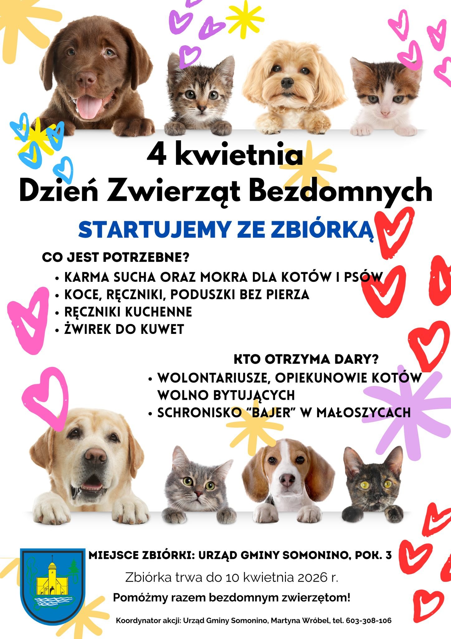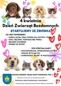 Z okazji Dnia Zwierząt Bezdomnych gmina Somonino, we współpracy z lokalnymi placówkami, organizuje zbiórkę karmy i akcesoriów dla potrzebujących zwierząt.