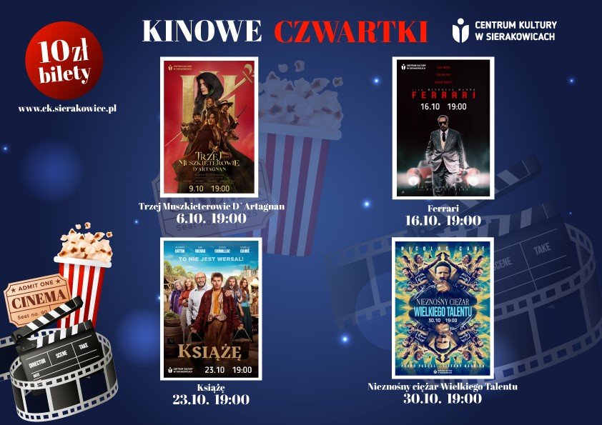 Centrum Kultury w Sierakowicach zaprasza na jesienne seanse filmowe w ramach cyklu Kinowe Czwartki. Projekcje odbywać się będą w sali kinowej CK, a bilety wstępu kosztują 10 zł.