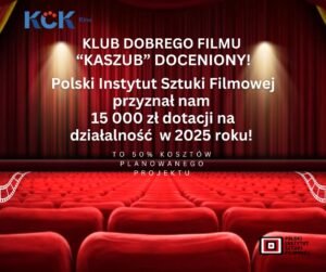 Klub Dobrego Filmu “Kaszub” w Kartuzach otrzymał dotację w wysokości 15 000 zł na rok 2025 od Polskiego Instytutu Sztuki Filmowej. Dzięki temu wsparciu, klub będzie mógł realizować jeszcze ciekawsze i bardziej wartościowe projekty filmowe.