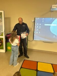 W trakcie wizyty asp. Hejna wręczył dzieciom odblaski, które mają zwiększyć ich widoczność na drodze, szczególnie w okresie jesienno-zimowym, gdy dni są krótkie, a warunki atmosferyczne często sprzyjają niebezpiecznym sytuacjom. Dzięki tym prostym, ale skutecznym rozwiązaniom droga do przedszkola czy szkoły będzie jeszcze bardziej bezpieczna.