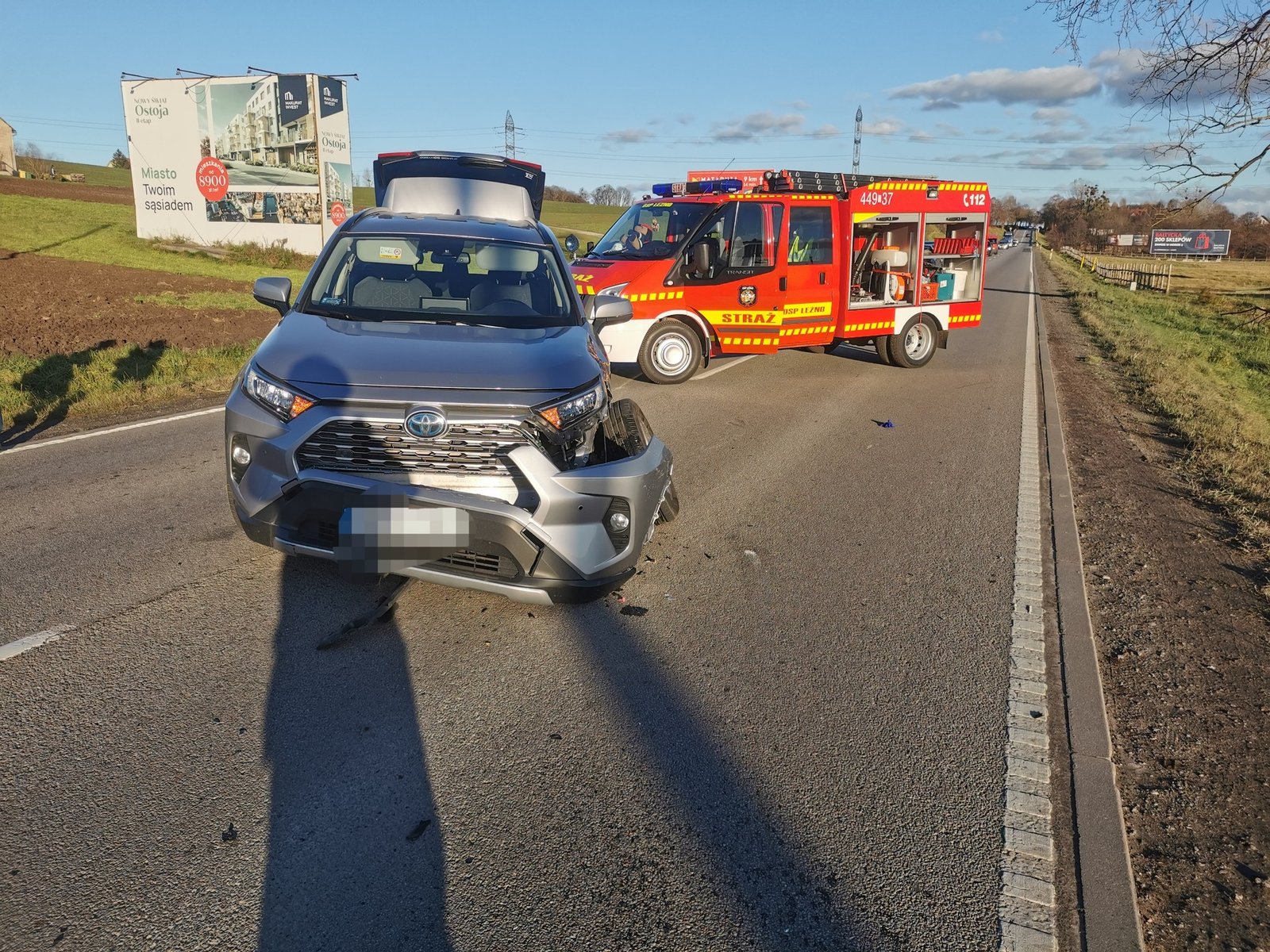 Poszkodowany motocyklista został zabrany do szpitala. Droga była zablokowana, a na miejscu były 3 zastępy straży pożarnej – z Leźna, Żukowa i Kartuz.