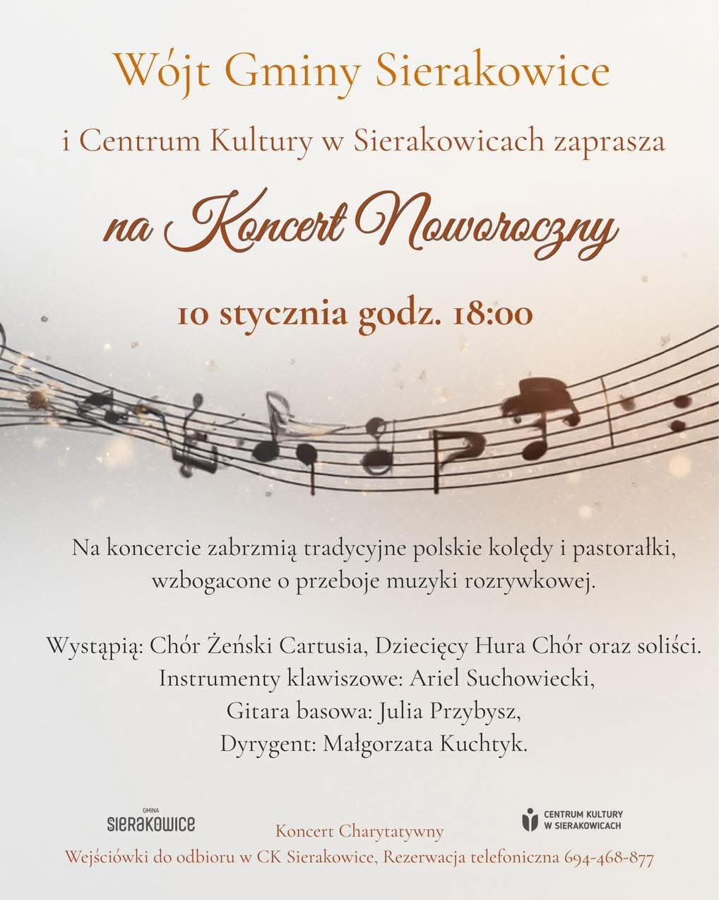 W Centrum Kultury w Sierakowicach odbędzie się Noworoczny Koncert, podczas którego publiczność wysłucha kolęd, pastorałek oraz utworów muzyki rozrywkowej w wykonaniu lokalnych artystów. Na scenie zaprezentują się Chór Żeński Cartusia, Dziecięcy Hura Chór, a także soliści oraz muzycy: Ariel Suchowiecki na instrumentach klawiszowych i Julia Przybysz na gitarze basowej. Za przygotowanie artystyczne odpowiada dyrygent Małgorzata Kuchtyk.