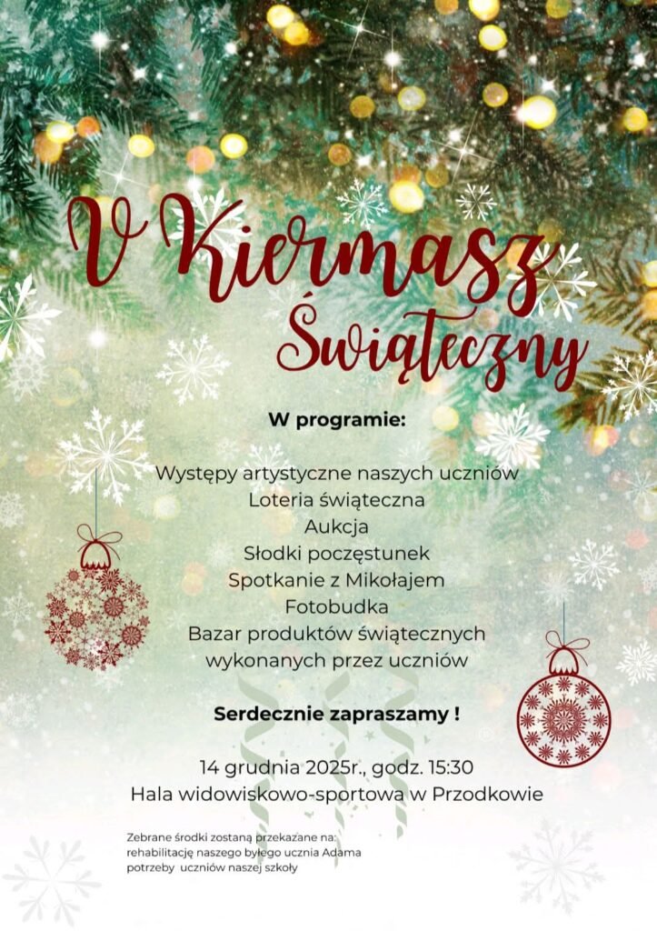 Szkoła Podstawowa im. Antoniego Abrahama w Przodkowie po raz piąty zaprasza mieszkańców gminy oraz wszystkich sympatyków świątecznej atmosfery na wyjątkowe wydarzenie – V Kiermasz Świąteczny, który odbędzie się 14 grudnia 2025 r. o godz. 15.30 w hali widowiskowo-sportowej w Przodkowie. To niezwykła okazja, aby poczuć klimat nadchodzących świąt, wesprzeć szczytne cele oraz spędzić czas w rodzinnej, pełnej radości atmosferze.
