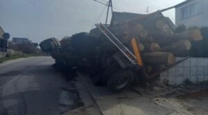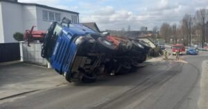 AKTUALIZACJA – 31.03.2025r. godz 14.45 – ze wstępnych ustaleń funkcjonariuszy wynika, że kierujący pojazdem ciężarowym 47-latek, nie dostosował prędkości do panujących warunków ruchu drogowego w wyniku czego, na łuku drogi doprowadził do wywrócenia swojego pojazdu, mężczyzna został ukarany mandatem karnym w wysokości 2000 złotych.