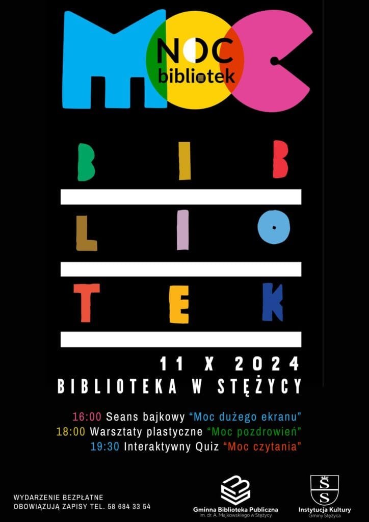 Wielkimi krokami zbliża się NOC BIBLIOTEK 2024! Hasło tegorocznej akcji to „Moc bibliotek”. X jubileuszowe wydanie ogólnopolskiej Nocy Bibliotek odbędzie się w piątek 11 października 2024 r. w tysiącach bibliotek w całej Polsce. Biblioteka w Stężycy już po raz trzeci zabierze Czytelników na ucztę pełną niezapomnianych wrażeń!