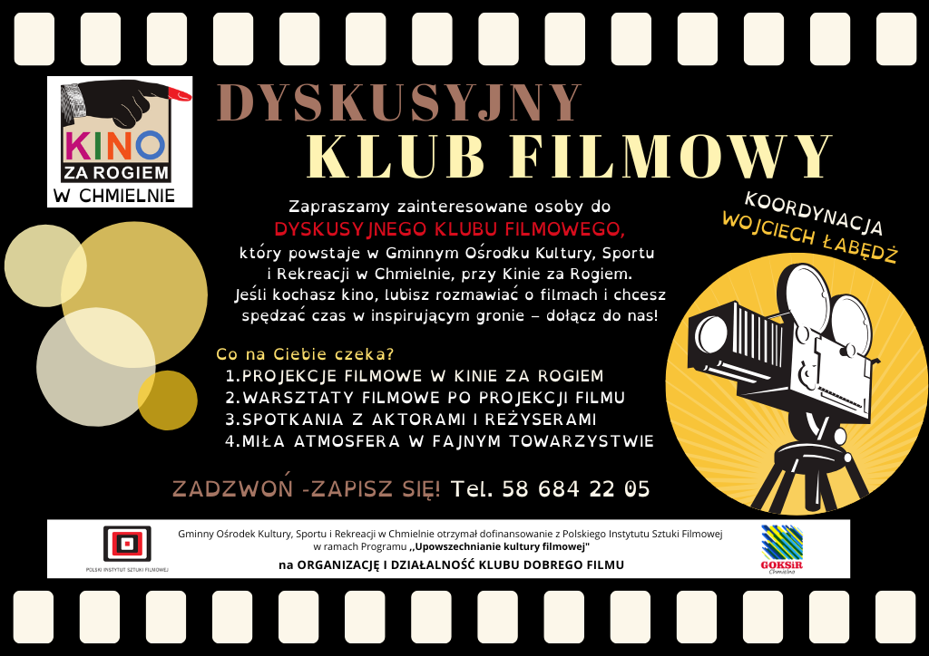 Gminny Ośrodek Kultury, Sportu i Rekreacji w Chmielnie zaprasza wszystkich pasjonatów kina do udziału w nowo powstającym Dyskusyjnym Klubie Filmowym działającym przy Kinie za Rogiem w Chmielnie.