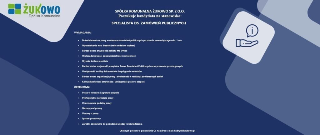 Spółka Komunalna Żukowo poszukuje osoby na stanowisko: Specjalista ds. zamówień publicznych.