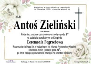 - Msza Święta pogrzebowa rozpocznie się 8 kwietnia 2026 r. o godz. 10.00 w kościele pw. św. Michała Archanioła,