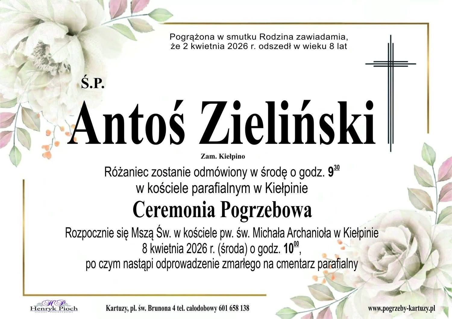 Z głębokim smutkiem przyjęto informację o śmierci 8-letniego Antosia Zielińskiego, mieszkańca Kiełpina. Chłopiec zmarł 2 kwietnia 2026 roku, po walce z chorobą.