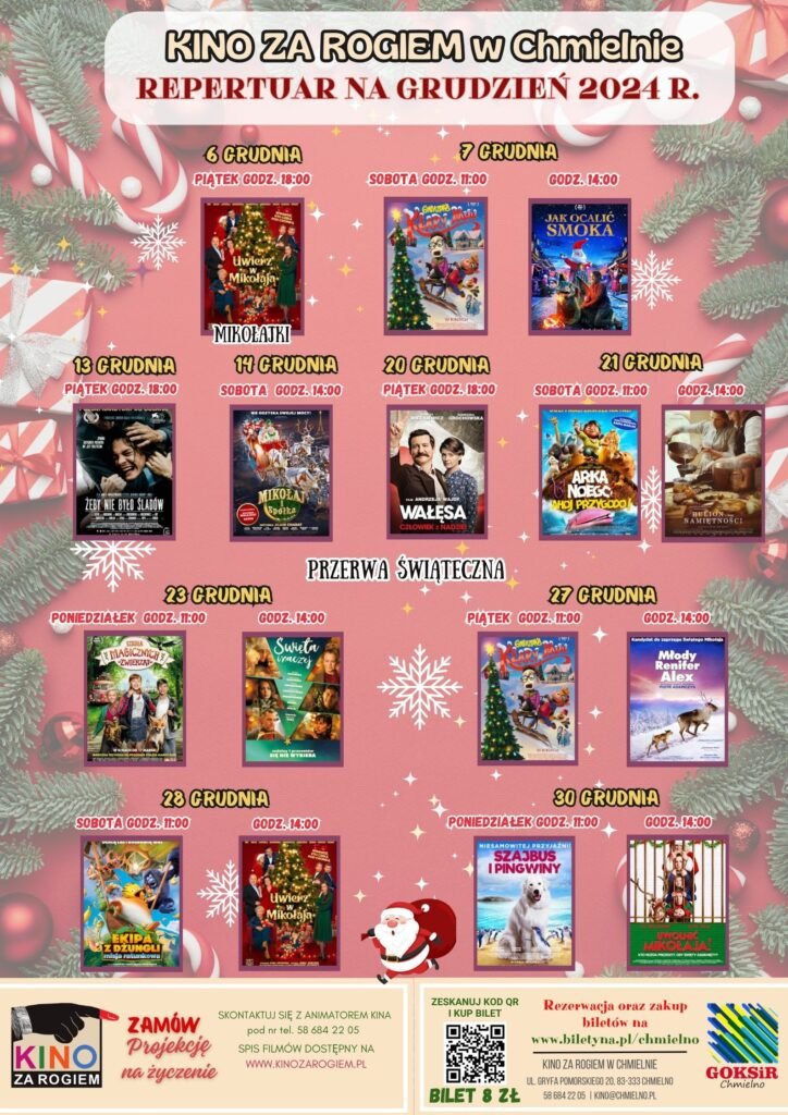 Grudzień zbliża się wielkimi krokami, a Gminny Ośrodek Kultury, Sportu i Rekreacji w Chmielnie ma dla swoich mieszkańców i gości wiele interesujących propozycji filmowych.