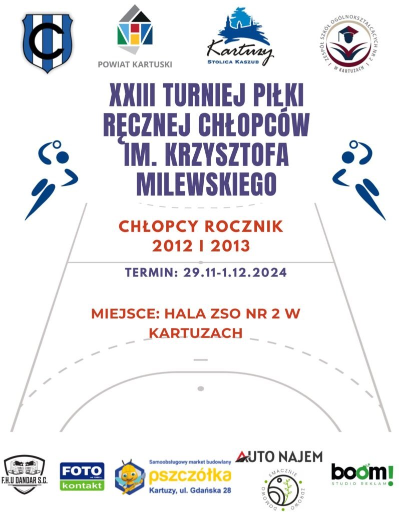 Sekcja piłki ręcznej GKS Cartusia oraz ZSO 2 Kartuzy z dumą ogłaszają organizację turnieju piłki ręcznej dla chłopców rocznika 2012 i 2013. Impreza, objęta patronatem gminy Kartuzy oraz powiatu Kartuskiego, odbędzie się w dniach 29 listopada – 1 grudnia 2024 roku.