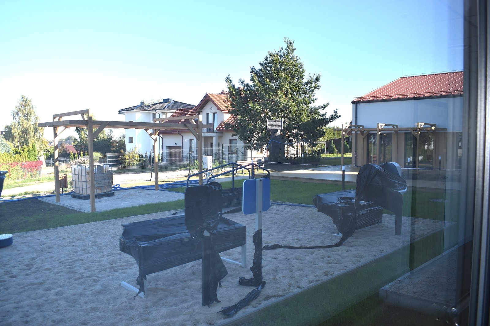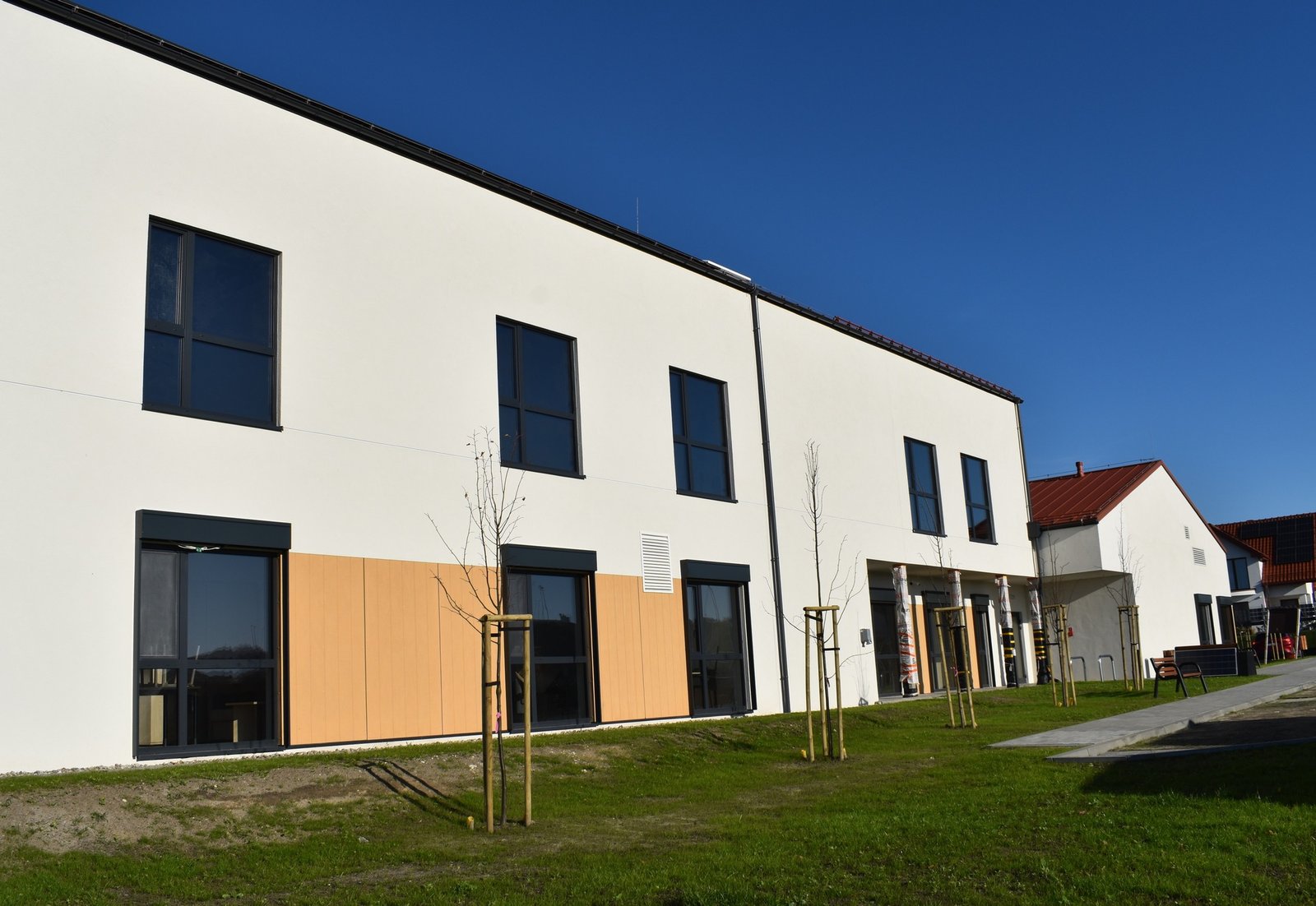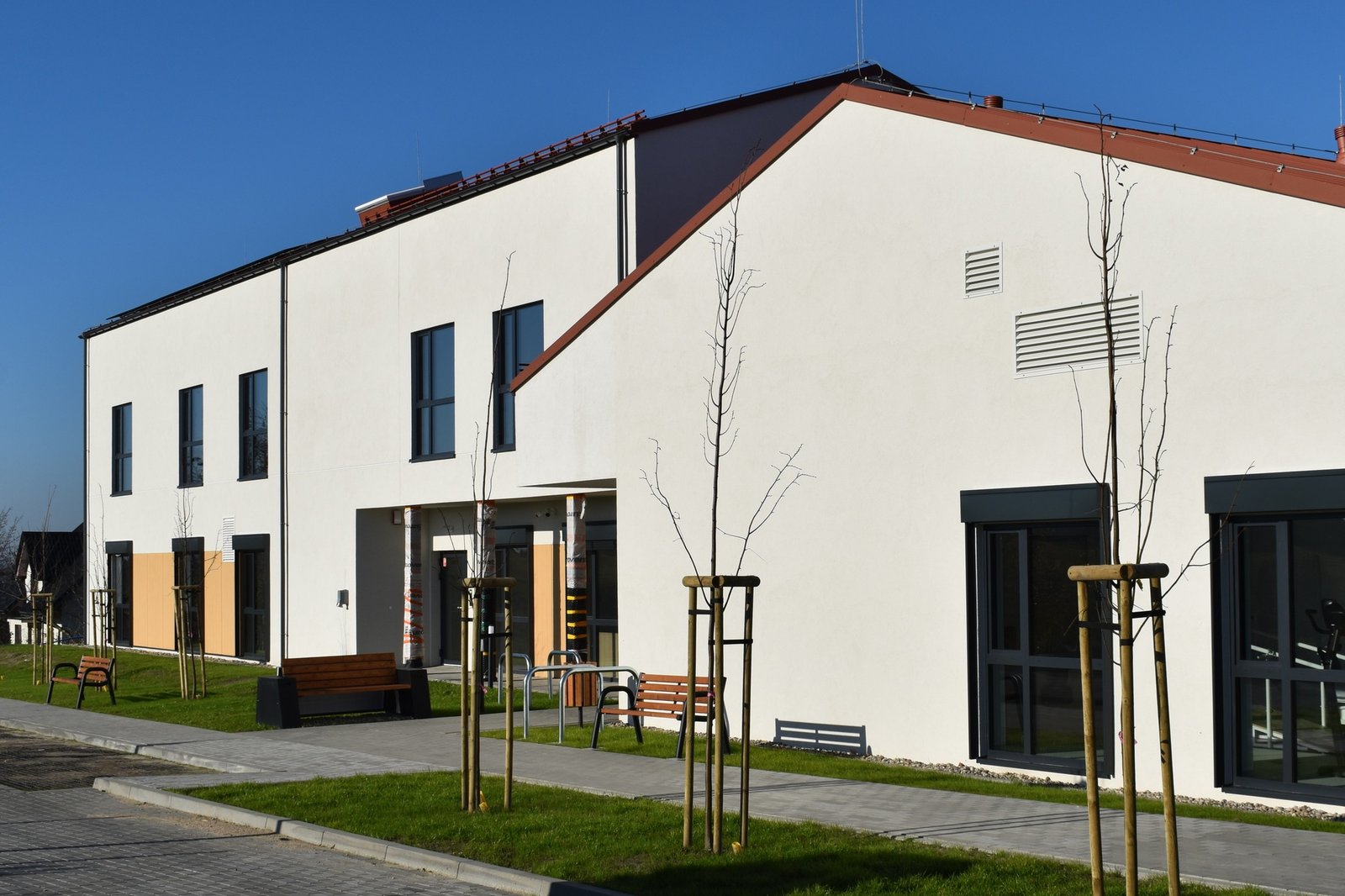 Inwestycja obejmuje także pełne zagospodarowanie terenu: powstała droga pożarowa, utwardzone dojścia oraz parking z 15 miejscami, w tym 2 miejsca w garażu i 2 dla osób z niepełnosprawnościami. Zakończenie prac zaplanowano na grudzień 2025 r.