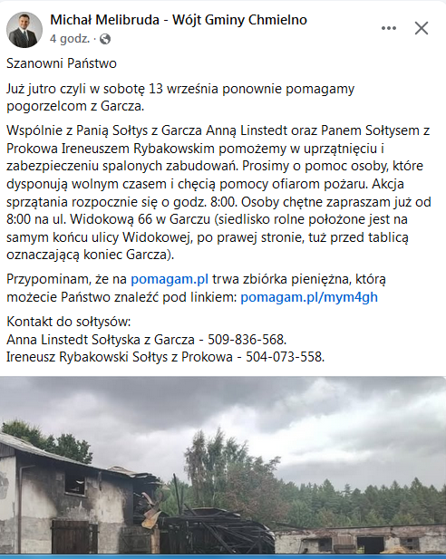 Do wspólnego działania na rzecz pogorzelców zachęca Michał Melibruda, wójt gminy Chmielno, który wraz z Panią sołtys Anną Linstedt (Garcz) oraz sołtysem Ireneuszem Rybakowskim (Prokowo) zapraszają wszystkich chętnych do pomocy w uprzątnięciu i zabezpieczeniu spalonych zabudowań.
