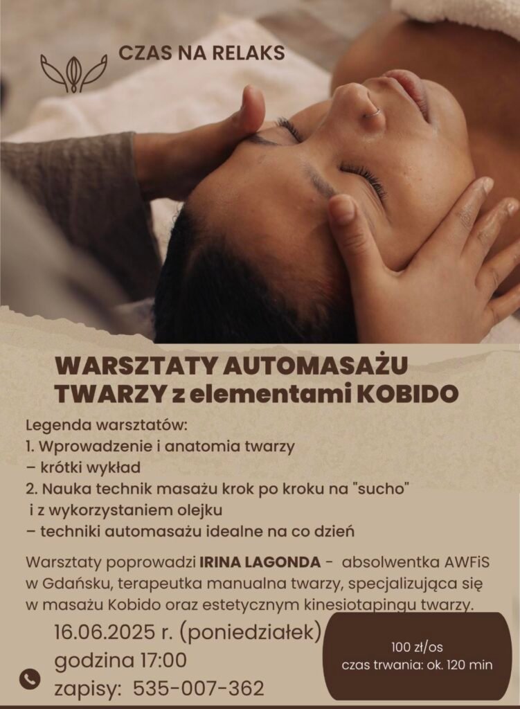 W poniedziałek, 16 czerwca o godzinie 17.00, w Gminnej Publicznej Bibliotece w Przodkowie odbędą się relaksacyjne warsztaty automasażu twarzy z elementami Kobido.