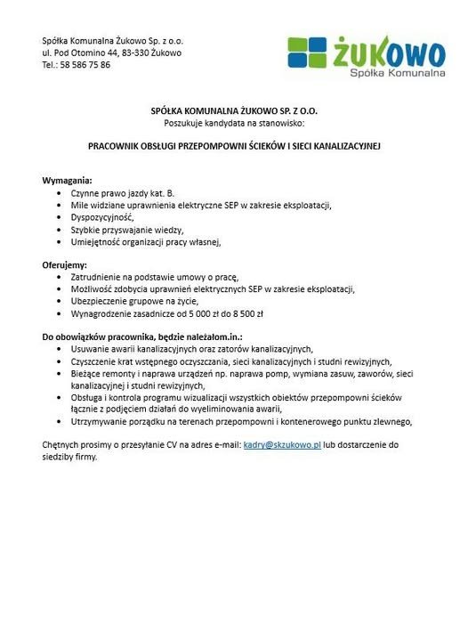 Spółka Komunalna Żukowo sp. z o.o. poszukuje kandydata na stanowisko: