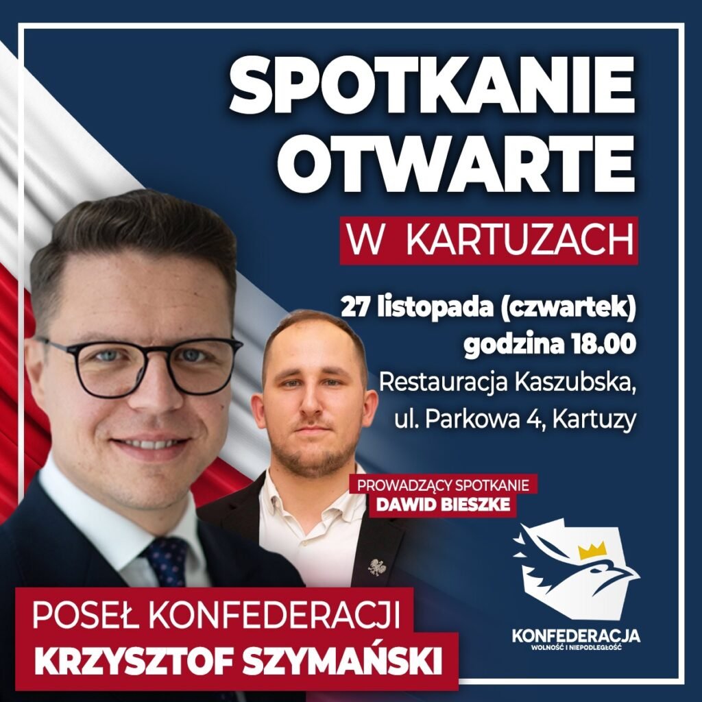Jutro (czwartek) o godzinie 18.00 w Restauracji Kaszubskiej przy ul. Parkowej 4 w Kartuzach odbędzie się spotkanie otwarte z posłem RP Krzysztofem Szymańskim. Wydarzenie ma na celu przybliżenie uczestnikom zagadnień związanych z pracą parlamentarną oraz funkcjonowaniem życia politycznego.