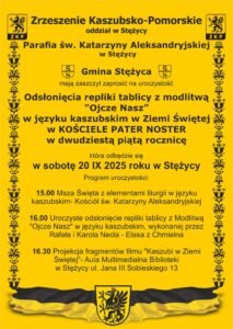 W sobotę, 20 września 2025 roku, w Stężycy odbędzie się wyjątkowa uroczystość odsłonięcia repliki tablicy z modlitwą „Ojcze Nasz” w języku kaszubskim. Oryginał od 25 lat znajduje się w Kościele Pater Noster w Ziemi Świętej, będąc symbolem obecności Kaszubów w duchowej przestrzeni Jerozolimy.