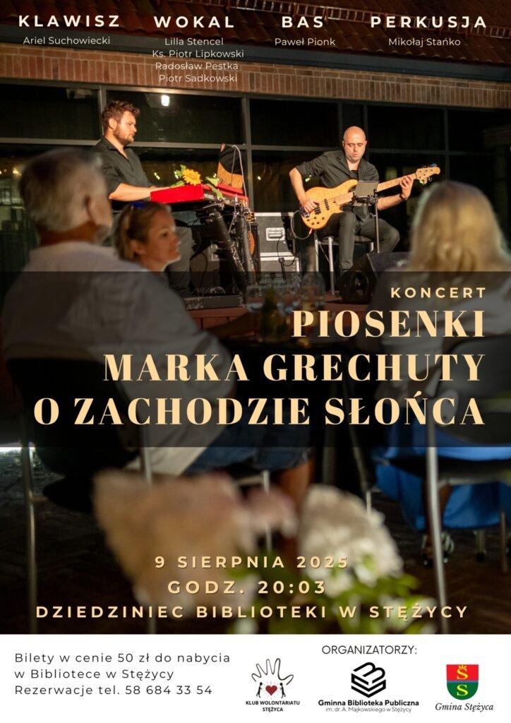 W sobotę, 9 sierpnia, na dziedzińcu Gminnej Biblioteki Publicznej w Stężycy odbędzie się wyjątkowy koncert o zachodzie słońca, podczas którego zabrzmią utwory z repertuaru Marka Grechuty.