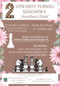 II Otwarty Turniej Szachowy „Kaszëbsczi Zymk” odbędzie się 21 marca 2026 roku w Domu Kultury w Chmielnie. Organizatorzy zapraszają wszystkich zainteresowanych – zarówno doświadczonych zawodników, jak i osoby dopiero rozpoczynające swoją przygodę z szachami.